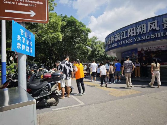 节前,市城市管理委员会发布《关于2025年国庆黄金周期间在桂林市中心区域设立共享电动自行车禁停区的通告》《致广大市民和游客的一封信》,明确10月1日至10月8日,在“两江四湖”核心区域及滨江路、文明路、榕城路、桂林站周边、解放东路等重点路段设立禁停区,原停放点临时取消使用。通过企业APP弹窗、媒体平台、户外Led屏等多种渠道广泛宣传引导,确保市民和游客知晓。