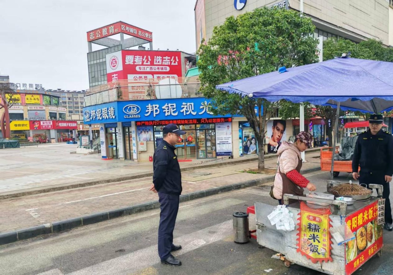 新城商圈作为雁山城区人流密集区域,商铺林立、人员往来频繁,部分流动摊贩占道经营现象时有发生,不仅影响市容环境,也给市民出行带来不便。