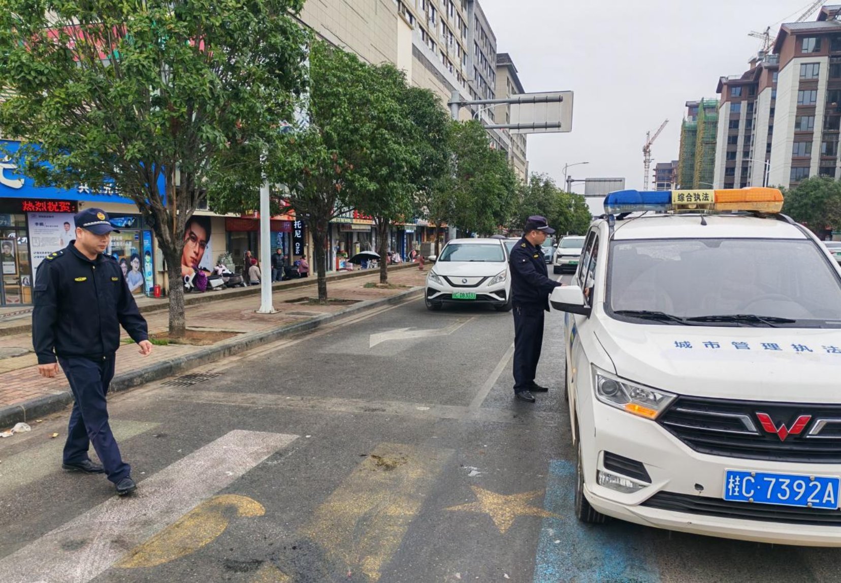 近日,雁山区城管局执法人员在雁山新城商圈开展日常市容巡查,重点整治占道经营、车辆乱停乱放等问题。