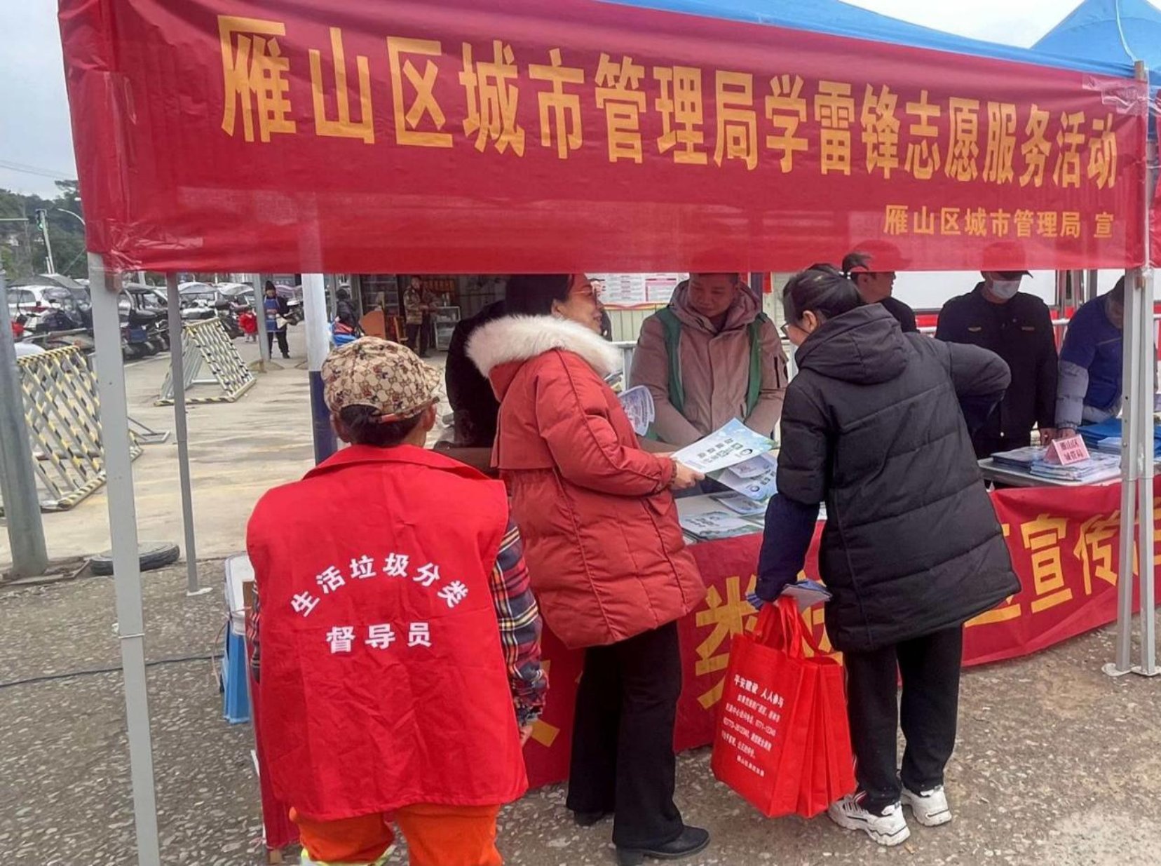 雁山区环卫站组织工作人员开展垃圾分类宣传志愿服务活动,以实际行动传承和弘扬雷锋精神。