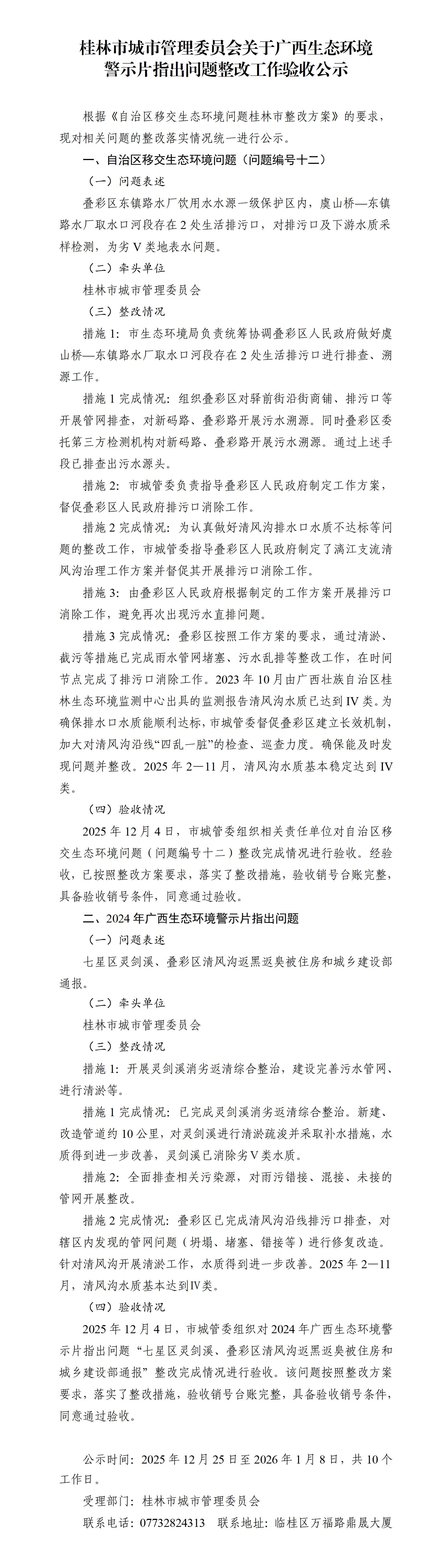 桂林市城市管理委员会关于广西生态环境警示片指出问题整改工作验收公示