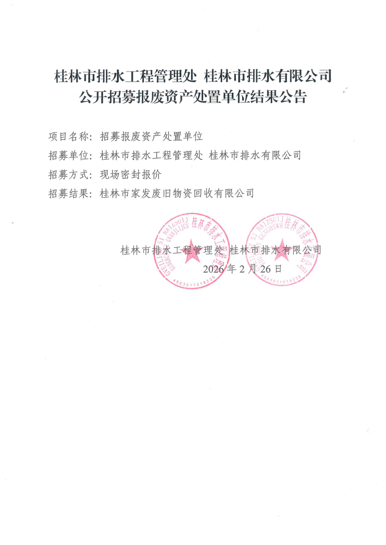 桂林市排水工程管理处桂林市排水有限公司公开招募报废资产处置单位结果公告