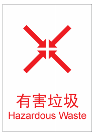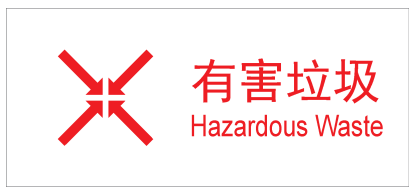 有害垃圾收集容器应为红色,色标为PANTONE 485C(C:0,M:0,Y:100,K:30),容器上设有统一、清晰的有害垃圾标识,详见表1。