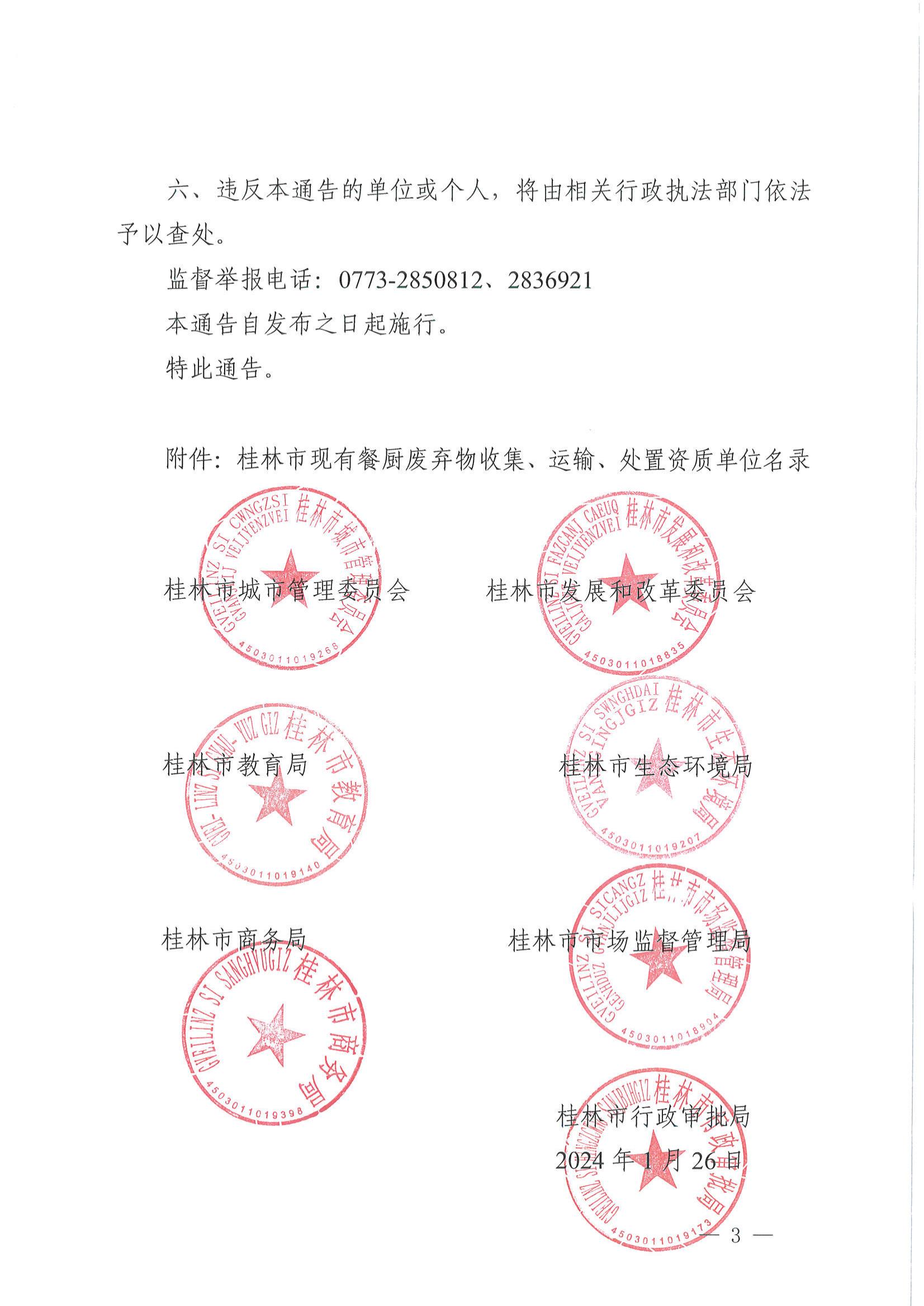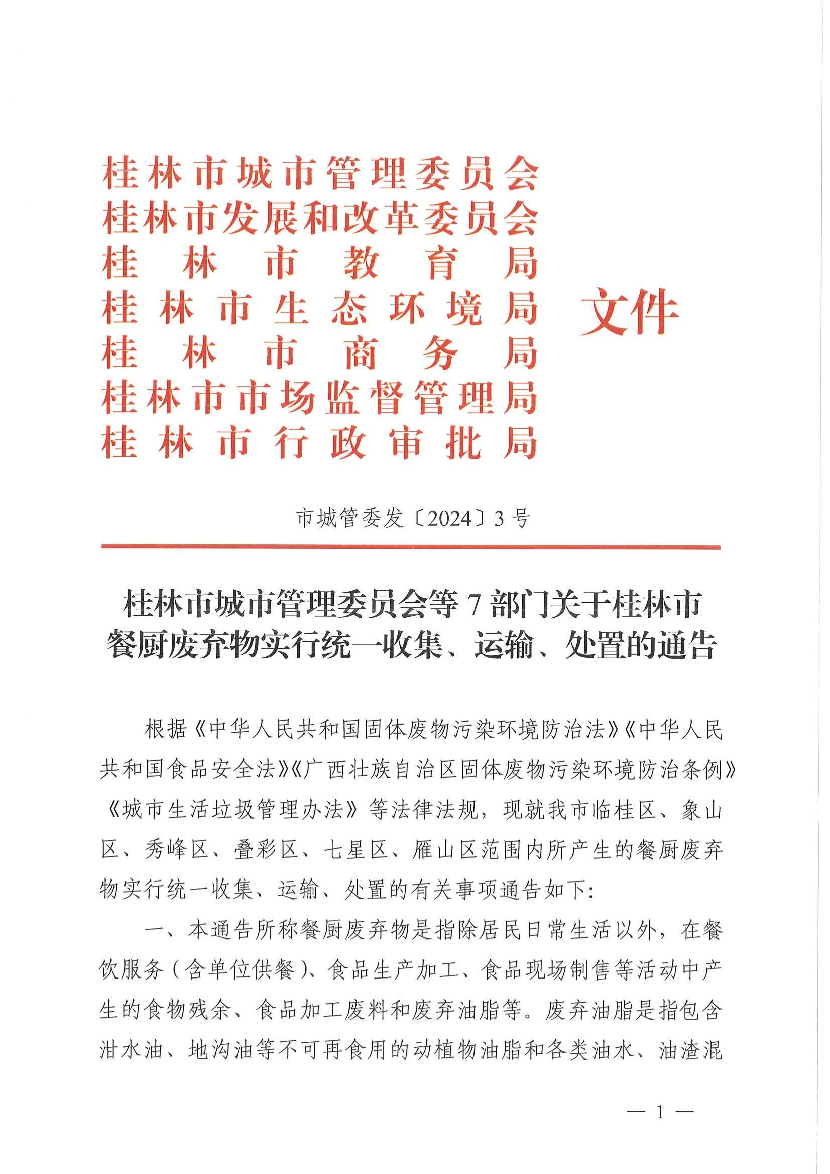 桂林市城市管理委员会等7部门关于桂林市餐厨废弃物实行统一收集、运输、处置的通告