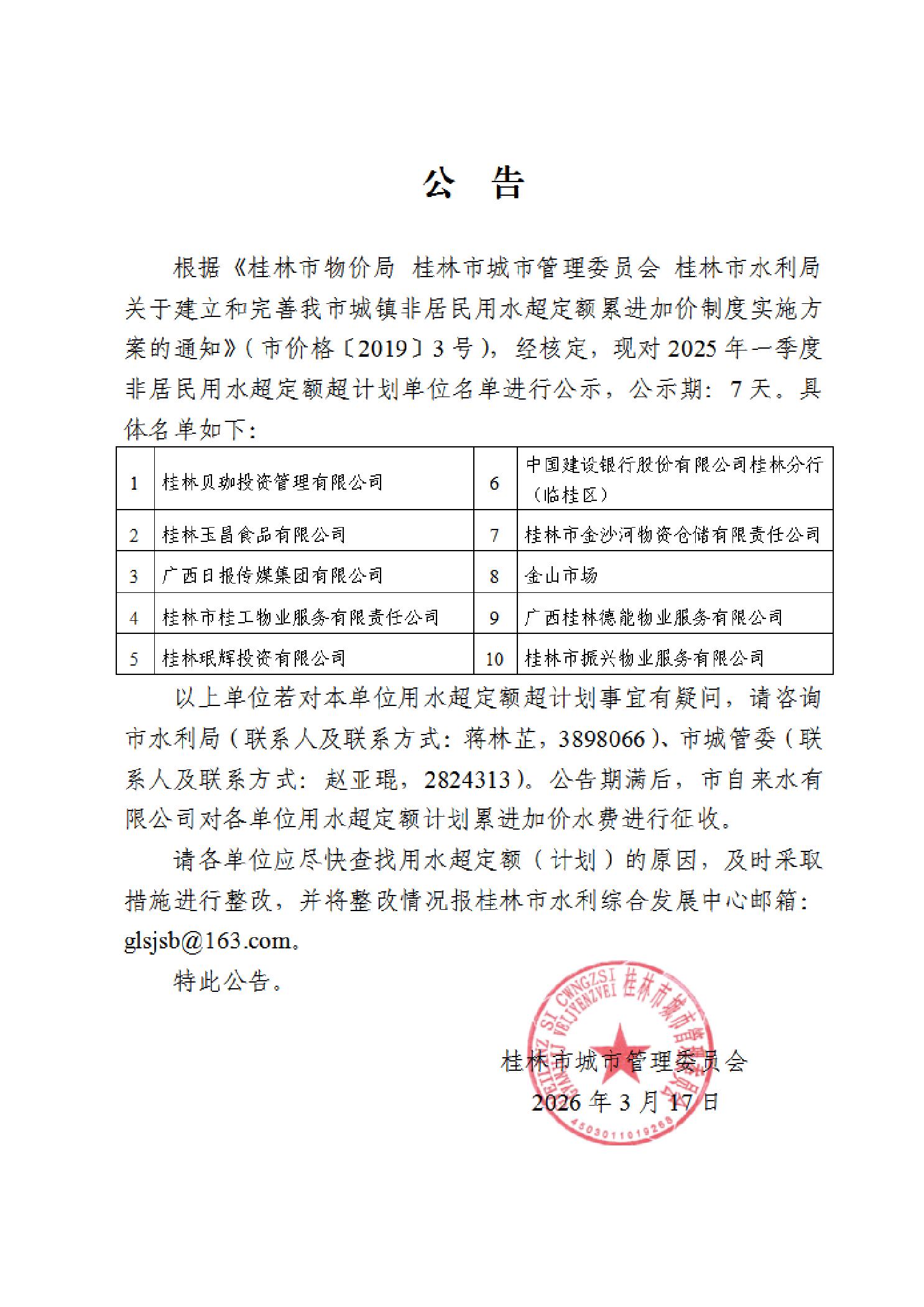 公告(2025年一季度非居民用水超定额超计划单位名单)