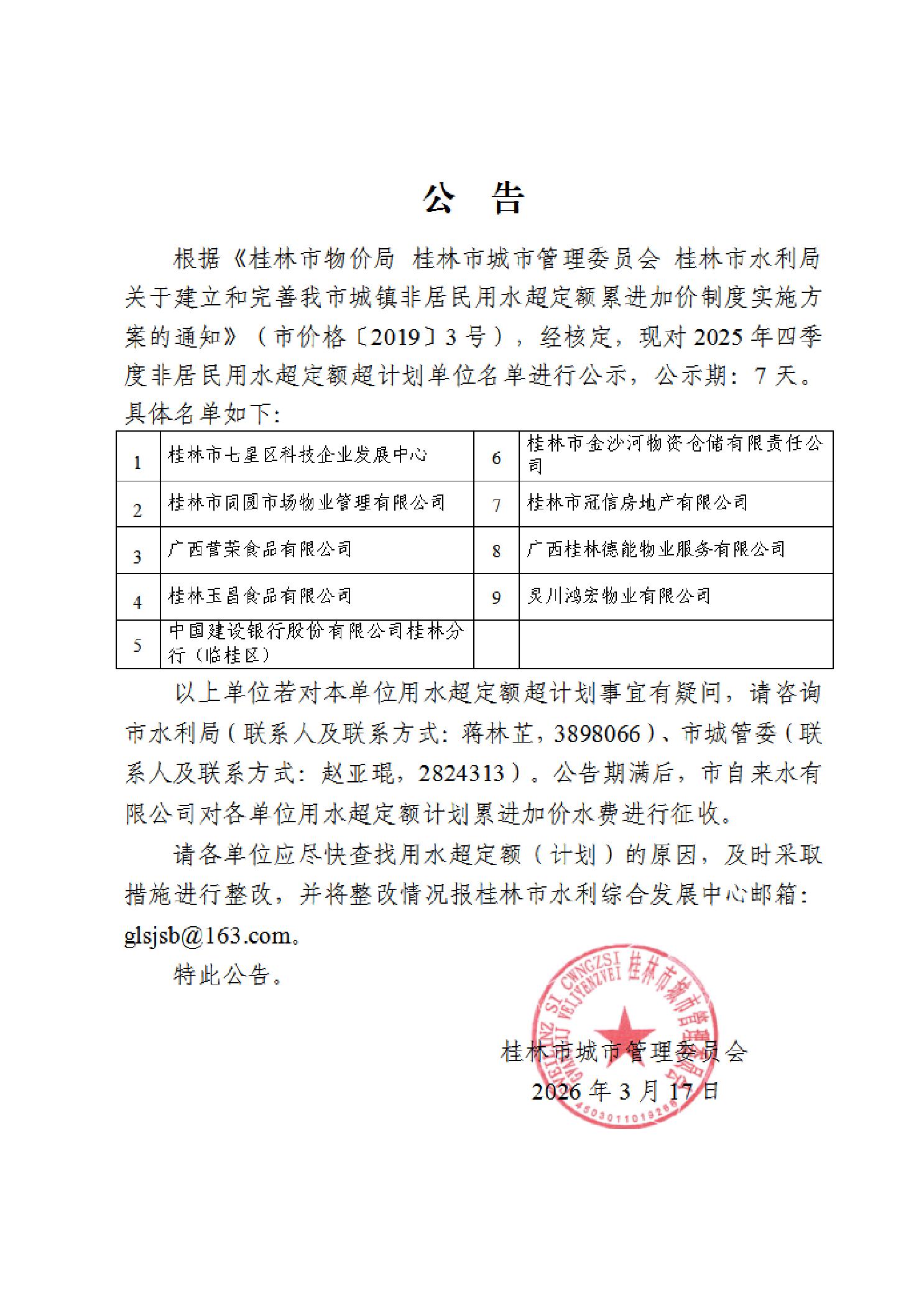 公告(2025年四季度非居民用水超定额超计划单位名单)