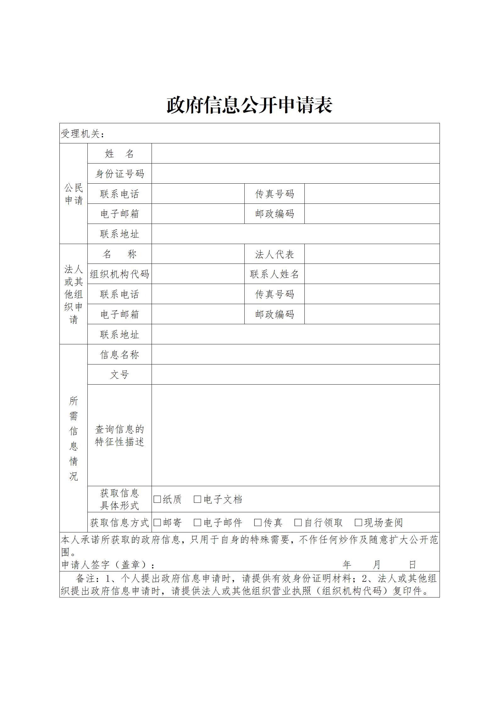 第八条 公民、法人或者其他组织依照本制度第四条规定向我委申请获取政府信息的,应当采用书面形式(包括数据电文形式);采用书面形式确有困难的,申请人可以口头提出,由我委有关人员代为填写政府信息公开申请。申请人通过互联网提出申请的,应当在政府门户网站上填写电子版《政府信息公开申请表》,通过电子邮件方式发送至我委电子邮箱;通过信函方式提出申请的,应当在信封左下角注明“政府信息公开申请”字样;通过电报、传真方式提出申请的,应当相应注明“政府信息公开申请”字样。